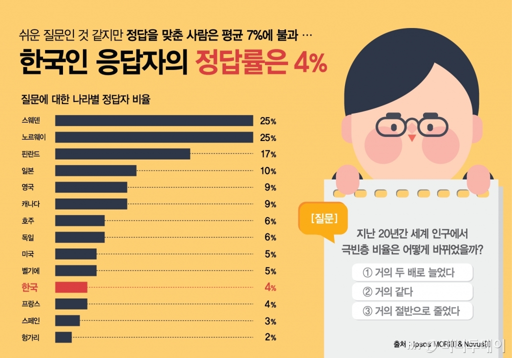 정답은 ③이다. 쉬운 질문인 것 같지만 정답을 맞춘 사람은 7%에 불과했다. 한국인 응답자의 정답률은 4%였다. 우리 모두가 오해 속에서 세상을 바라보고 있다는 반증이다.