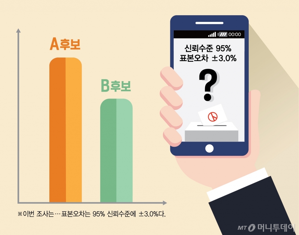 여론조사 결과를 발표할 때 항상 뒤따르는 것이 신뢰수준과 표본오차이다. ‘표본오차는 95% 신뢰수준에서 ±4.4%’와 같은 식이다. 먼저 신뢰수준이 95%이라는 건 이 여론조사를 95% 믿을 수 있다는 뜻이 아니라 같은 조사를 100번 하면 표본오차 범위 내에서 동일한 결과가 나올 횟수가 95번이라는 의미다. 표본오차는 표본의 크기가 커질수록 줄어들고, 작아지면 늘어난다.