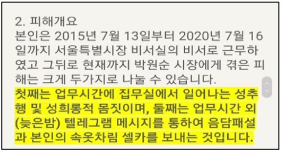 재판부는 이날 선고에서 "피해자가 2020년 5월1일부터 정신과 상담과 약물치료를 받았고, 5월15일부터 고 박원순 전 서울시장 성추행 사실을 진술하기 시작한 사실을 인정할 수 있다"고 밝혔다. 재판부가 공개한 피해자의 진술은 "박원순 시장 밑에서 근무한 지 1년 반 이후부터 박원순이 야한 문자, 속옷 차림의 사진을 보냈고 '냄새 맡고 싶다, 사진을 보내달라'는 등의 문자를 받았다" "다른 부서로 이동했는데, 2019년 2월에 '섹스를 알려주겠다, 남자를 알려주겠다'며 성관계 이야기를 했다"는 내용이었다. 재판부는 "피해자가 박원순 성추행으로 인해 상당한 정신적 고통 받은 건 사실"이라고 밝혔다.(한겨레신문 2012년 1월14일자)