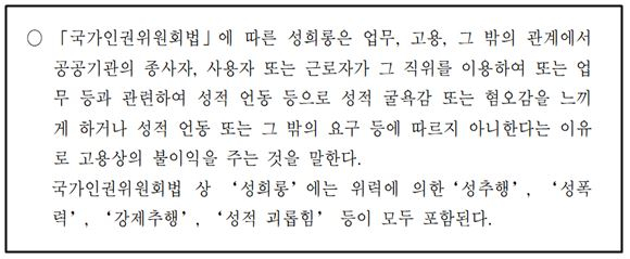 - 다만, 인권위는 피해자의 주장 외에 행위 발생 당시 이를 들었다는 참고인의 진술이 부재하거나 휴대전화 메시지 등 입증 자료가 없는 경우 사실로 인정하기 어렵다고 판단하였다. 이는 피조사자의 진술을 청취하기 어렵고 방어권을 행사할 수 없는 상황에서 일반적 성희롱 사건보다 사실 관계를 좀 더 엄격하게 인정한데 따른 것이다.