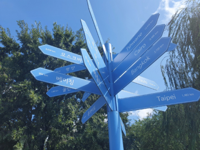100일 장정을 마치기 하루 전인 9월22일. 광나루 토끼굴 인근에 세워져 있는 이정표 아래서 기념 한 컷 남겼다. 베이징까지 거리 954km. 100일간 달린 거리가1047.89km이니 베이징을 도달하고도 남는 거리다.