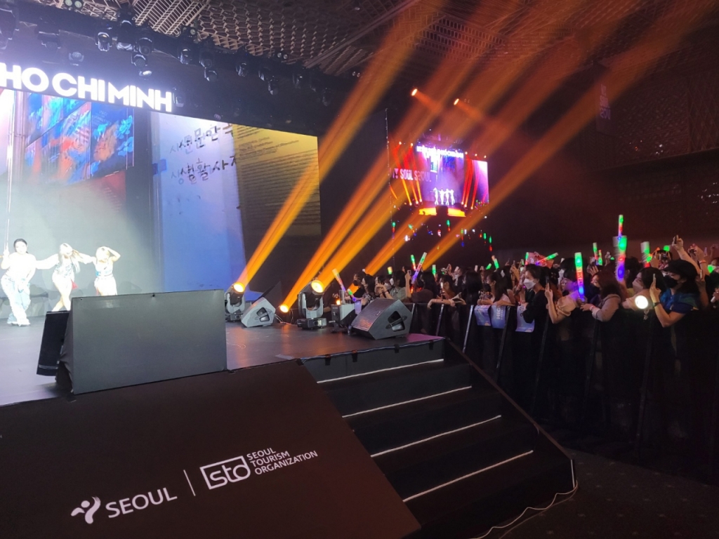 지난 2일 오후 찾은 베트남 호찌민 젬센터(Gem Center) 5층은 경쾌한 케이(K)팝 음악과 10~20대 베트남 관객들의 환호성으로 가득 찼다. 900여명에 달하는 이들의 손에는 '마이 소울 서울'(My Soul Seoul)이라는 문구가 적힌 야광봉과 케이팝 스타들을 응원하는 팻말 등이 있었다.