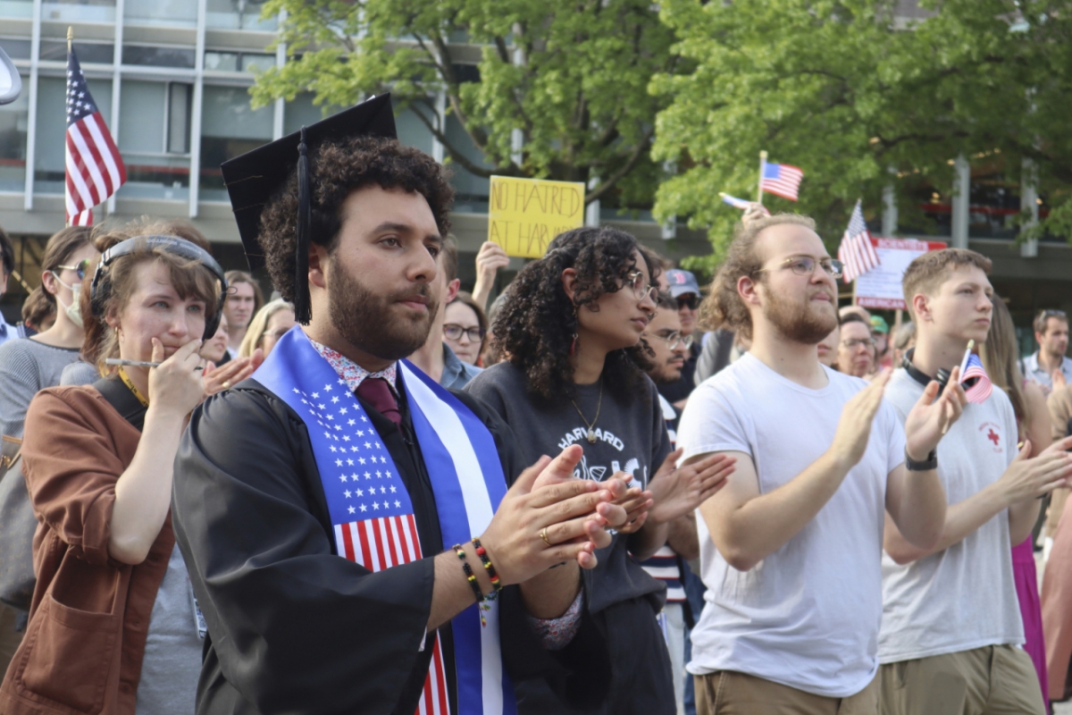 ![[캠브리지(매사추세츠)=AP/뉴시스] 하버드대 졸업생인 빅터 플로레스를 비롯한 학생들이 27일(현지 시간) 한 학생의 연설에 박수를 치고 있다. 이날 수백 명의 학생이 교내에서 열린 반트럼프 시위에 참가했다. 2025.05.28.](https://thumb.mt.co.kr/cdn-cgi/image/f=avif/21/2025/05/2025052910313526748_1.jpg)
