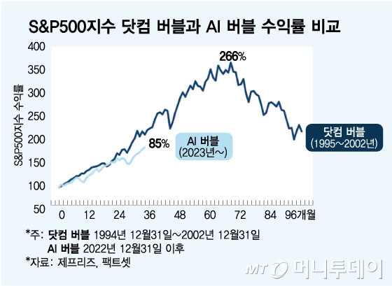 제프리즈의 퀀트 전략팀은 지난주 보고서에서 닷컴 버블 당시 S&P500지수는 5년 3개월간 266% 급등했지만 AI 랠리가 진행 중인 현재는 3년 가까이 85% 올랐다며 이익도 없는 닷컴 기업들과 비교할 때 강력한 수익 창출력을 갖춘 AI 기업들은 추가 상승 여력이 충분하다고 주장했다.