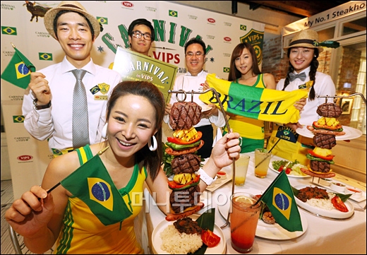 CJ푸드빌 스테이크 하우스 빕스가 4일 서울 쌍림동 빕스 푸드월드점에서 여름 신메뉴인 '브라질리언 쌈바 스테이크' 외 신메뉴 3종을 출시해 제품을 선보이고 있다.