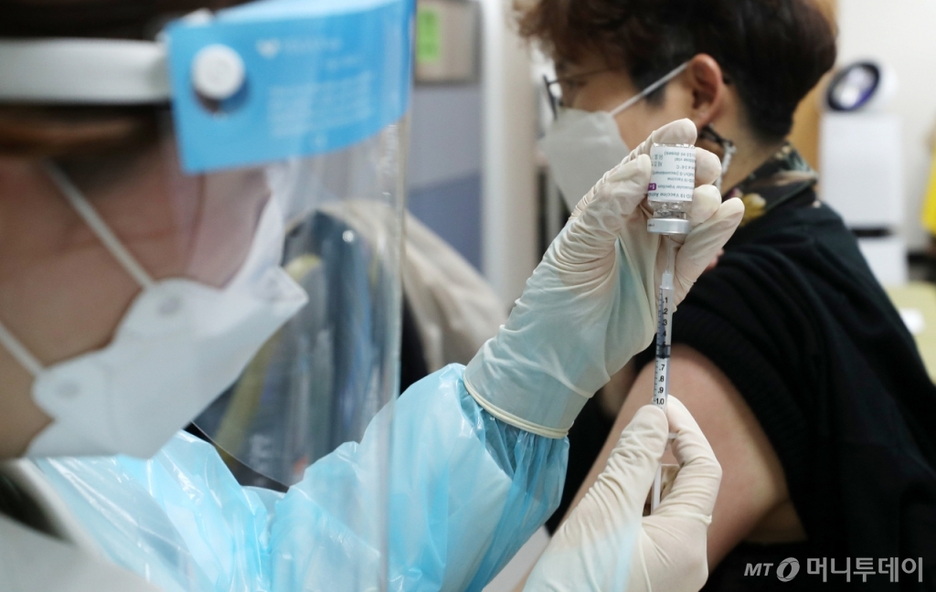 '혈전 논란'으로 미뤄졌던 특수학교 종사자와 보건교사, 감염시설 종사자, 60세 미만 등에 대한 아스트라제네카 백신 접종이 재개된 12일 서울 중랑구보건소에서 한 대상자가 백신을 맞고 있다.