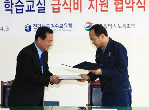 GS칼텍스노동조합은 3일 오전 여수교육청과 맞춤형학습교실 운영을 위한 급식비지원사업 협약식을 가졌다.
