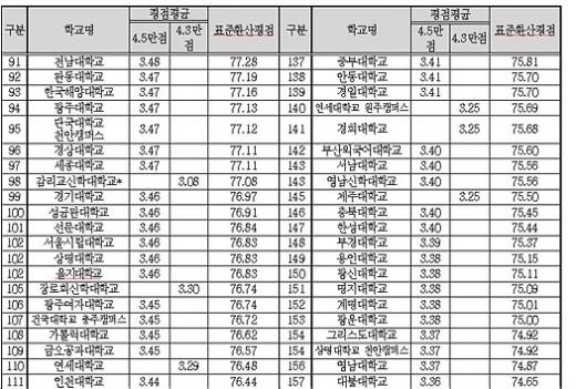 한국외국어대·건국대·고려대 등은 학점이 후한 반면 중앙대·서강대·경희대 등은 박한 것으로 나타났다. 또 4년제 일반대 졸업생의 91%는 B학점 이상을 받은 것으로 조사됐다.