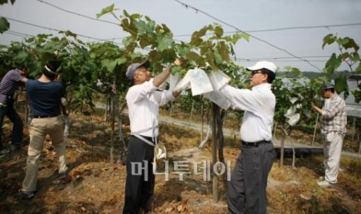 한국원자력연구원(원장 양명승, 사진 가운데 왼쪽) 직원들이 25일 자매결연 마을인 대전 유성구 관평동 포도재배 농가를 방문, 포도봉지 씌우기 농촌봉사 활동을 펼쳤다. 연구원은 지난 2006년 이 마을과 자매결연한 뒤 농산물 직거래 장터 운영을 비롯해 주민 음악회 개최, 무료 사진촬영 등의 다양한 협력과 교류를 추진해 오고 있다. 독자들의 PICK! 부부관계 2년 거부, 성기능 개선제 몰래 먹는 남편…유책 사유 될까 외도 들켜 이혼했는데…전처에 '간 이식' 부탁, "너무 뻔뻔" 분노 100만원도 못 벌던 개그맨..."수입 1000배" 변호사 된 깜짝 근황 '벌레 바글' 쓰레기집 만든 150㎏ 남편...입덧 아내에 "네가 치워"
