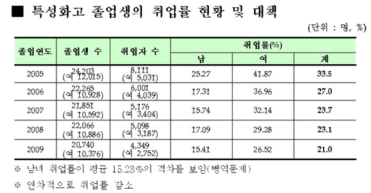간담회에서는 매년 낮아지는 특성화고 졸업생들의 취업률이 문제로 지적됐다. 시교육청이 제시한 자료에 따르면 특성화고 졸업생의 취업률은 2005년 33.5%에서 꾸준히 하락해 2009년 21.0%까지 떨어졌다.