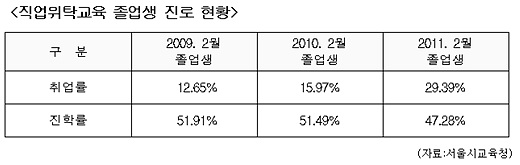 직업교육을 받은 학생들의 취업률도 해마다 높아지고 있다. 위탁교육기관 졸업생의 취업률은 2009년 12.65%, 2010년 15.97%, 2011년 29.39%로 높아진 반면 전문대 등에 진학한 비율은 같은 기간 51.91%, 51.49%, 47.28%로 줄어들었다.