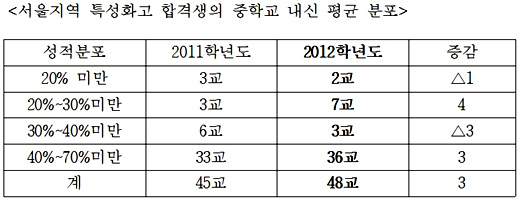 서울시교육청은 2012학년도 특성화고 신입생 모집을 실시한 결과 합격자들의 중학교 내신 성적이 평균 60.2%로 집계됐다고 25일 밝혔다. 이는 지난해 성적 평균(62.3%)보다 2.1%p, 2010학년도(64.2%)보다는 4.0%p 높아진 것이다.