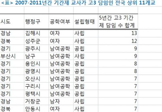 [표]기간제 교사가 고3 담임인 전국 상위 11개교