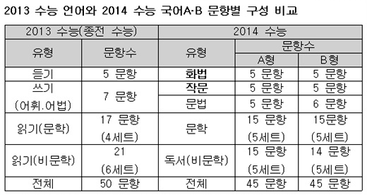 전체적으로 문학과 독서(비문학) 부분은 종전 수능과 비교해 크게 달라진 점이 없으나 듣기평가가 지필평가 '화법' 부분으로 대체되고 작문·문법 부분은 문제 유형에 변화가 생겼다.