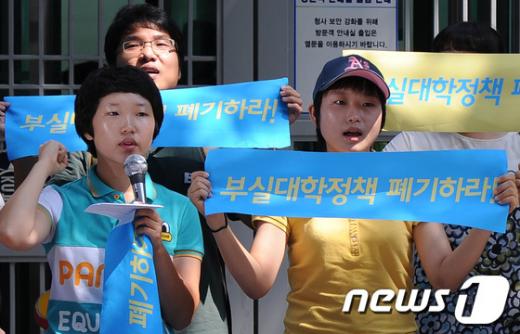 앞서 이날 오후 한국대학생연합(한대련)의 부실대학 선정 발표 규탄 집회에 참석한 이아해 국민대 학생 역시 "교과부가 자행하는 대학 구조조정이 누굴 위한 것인지 의심스럽다"며 "부실한 것은 학생이 아니라 정부"라고 주장했다.