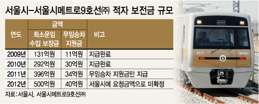29일 서울시 등에 따르면 메트로9호선은 지난해 지하철 9호선의 운영 적자를 보전하기 위해 지난 3월 말 540억원의 지원이 필요하다는 공문을 시에 보냈다. 최소운임 수입 보장금 500억원과 무임승차 지원금 40억원을 보전해달라는 것.