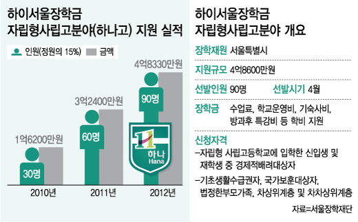 시 관계자는 11일 "서울장학재단이 하나고 정원의 15%인 90명에게 장학금을 지급하고 있는 것을 10% 수준으로 줄일 계획"이라며 "하나학원에 관련 방침을 전달하고 협의를 진행하고 있다"고 말했다. 지난 2010년 3월 서울 은평구 진관동 은평뉴타운에 문을 연 하나고는 하나금융그룹이 설립한 뒤 하나학원이 운영하고 있다.