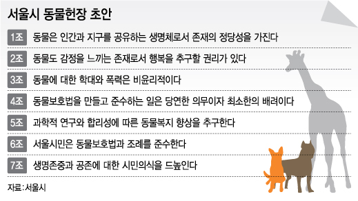 서울시가 최근 마련한 동물헌장 초안은 서울을 '사람과 동물이 더불어 행복해 특별한 도시'로 규정하고, 동물은 '이 세상을 함께 살아가는 존재로서 서울시민과 마찬가지로 서울에 살 권리를 갖는다'고 명문화했다.