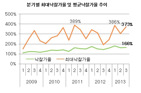 단지별로는 경남혁신도시 A4블록의 인기가 두드러졌다. 7개 점포 평균 공급예정금액은 3.3㎡ 기준 860만원이었지만 평균 2495만원에 낙찰됐다. 평균 낙찰가율 267%. 이는 2009년 이후 공급된 물량 중 단지 기준으로 가장 높은 낙찰가율이다.