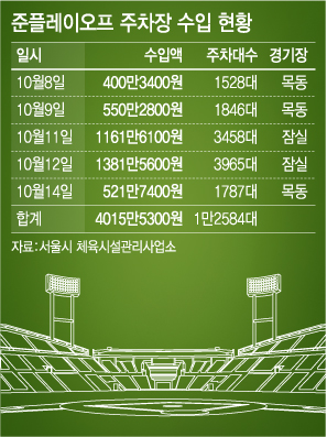 16일 서울시 산하 체육시설관리사업소 등에 따르면 지난 8일부터 14일까지 5연전으로 진행된 넥센과 두산의 준플레이오프 전에서 서울시가 추가로 올린 주차료 수입은 4015만원이다. 경기일자별 주차료 수입을 보면 △8일 400만원(목동) △9일 550만원(목동) △11일 1161만원(잠실) △12일 1381만원(잠실) △14일 521만원(목동) 등이다. 여기에 목동구장의 3일간 입장료 수입(약 9620만원)을 합치면 총 수입은 1억3635만원에 달한다. 플레이오프 입장료는 정규리그 때보다 2배 가량 비싸다.