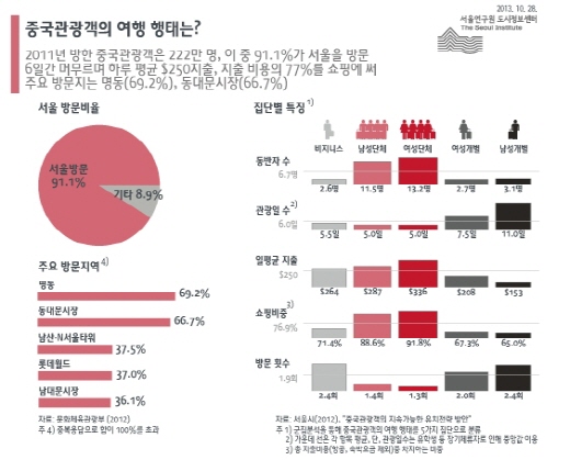 중국인 관광객이 서울에서 가장 많이 찾은 곳(복수응답)은 명동이 69.2%로, 동대문시장(66.7%)이나 남산(37.5%)보다 인기가 높았다. 한국의 고전 장소가 아닌 쇼핑할 수 있는 곳을 방문하는 것으로 연구원은 분석했다. 이들이 서울에 머무르는 기간은 평균 6일 정도 됐으며 쓴 비용은 하루 평균 250달러로 나타났다.