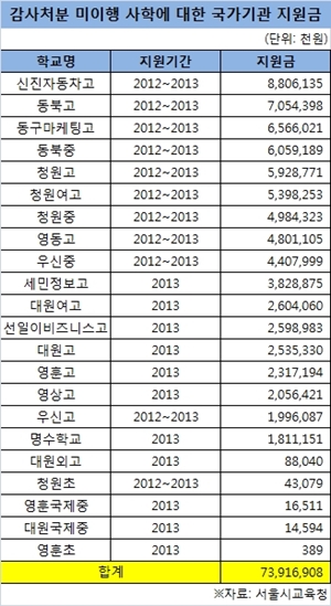 29일 윤명화 서울시의원이 서울교육청으로부터 제출받은 '2012~2013년 감사처분 미이행 학교에 대한 국가기관 예산 지원 현황'에 따르면 교육청 감사처분을 따르지 않은 사립학교 22곳이 교육청·서울시청·관할구청 등 국가기관으로부터 지원받은 예산은 739억1690만원으로 집계됐다.