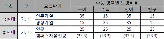 이 때 유불리를 따지는 기초 자료가 되는 것은 해당 대학, 학과의 수능 영역별 반영 비율이다. 2014학년도 대입 정시모집에서 숭실대 인문계열은 수능 각 영역을 '국어 B형 35%, 수학 A형 15%, 영어 B형 35%, 탐구 15%'의 비율로 반영한다. 반면 같은 문과임에도 경상계열은 '국어 B형 15%, 수학 A형 35%, 영어 B형 35%, 탐구 15%'로 반영한다.