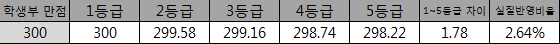 그렇다면 내신이 좋지 않은 수험생은 한양대를 가군에 쓰고 싶어도 수능 70%, 학생부 30%이기 때문에 무리라고 봐야 할까. 이치우 실장은 "정시모집에서 학생부를 반영하는 경우 반드시 실질 반영 비율을 살펴봐야 한다"며 "한양대는 상위 교과목을 선택 반영하는데다 300점 만점에 1등급 300점, 3등급은 299.16점으로 불과 1점 차이도 나지 않는다"고 설명했다. 한양대의 학생부 실질 반영 비율은 2.64%이다.