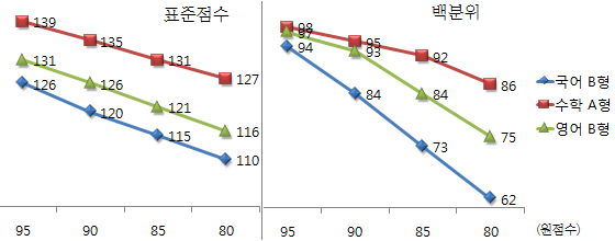 그런데 수학 A형의 경우에는 또 그렇지가 않다. 남윤곤 팀장은 "수학 A형의 경우 원점수 90점이 표준점수 125점, 원점수 85점이 표준점수 121점"인 반면 "원점수 90점의 백분위는 95, 원점수 85점의 백분위는 92로 오히려 백분위의 격차가 더 적다"고 설명했다.