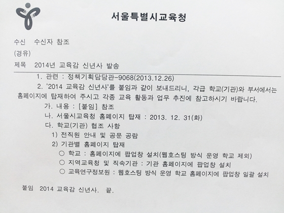 시교육청은 최초 공문에서 교육감 신년사를 학교 및 기관별 홈페이지에 탑재할 것을 요구하면서, 모든 직원의 공람과 홈페이지 팝업창을 설치하라고 지시했다. 그러면서 △학교: 홈페이지에 팝업창 설치(웹호스팅 방식 운영 학교 제외) △지역교육청 및 직속기관: 기관 홈페이지에 팝업창 설치 △교육연구정보원: 웹호스팅 방식 운영 학교 홈페이지에 팝업창 일괄 설치 등으로 게재 방식을 세분화해 알렸다.