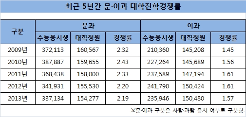 31일 국회 교육문화체육관광위원회 위원장인 신학용 새정치민주연합 의원이 교육부로부터 제출받은 '수능응시생 기준 문·이과 학생 수, 4년제 대학정원·취업률' 자료에 따르면 2013년 대입 경쟁률은 문과 2.19대 1, 이과 1.57대 1을 나타냈다.