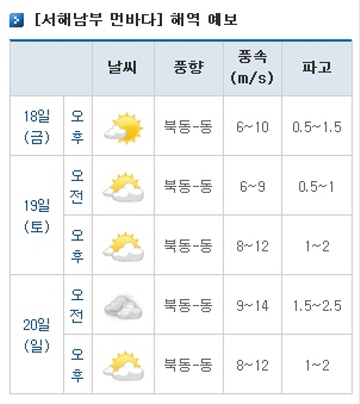 문제는 주말 날씨다. 19일 오전엔 구름이 많겠고 파고는 0.5~1m, 풍속은 초속 6~9m로 불고, 오후에는 파고는 1~2m, 풍속은 초속 8~12m로 불 것으로 기상청은 전망했다. 특히 20일 오전에는 흐린 날씨 속에 물결이 최고 2.5m까지 높게 일 것으로 기상청은 내다봤다.