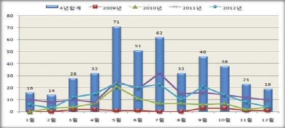 또 본격적인 농번기가 시작되면서 농기계 안전사고도 발생도 잦은 것으로 나타났다. 농기계 안전사고는 최근 4년간 5월에 514건 발생했는데 이는 10월(603건)에 이어 연중 두 번째로 높은 수치다.