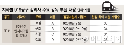 27일 머니투데이가 단독 입수한 서울시 감사결과 처분요구 보고서에 따르면, 지하철 919공구 감리사인 수성엔지니어링 등 감리원 4명은 2010년 9월부터 각각 1~2개월씩 공사현장 시공 상태를 점검하지 않는 등 감독이 부실했던 것으로 드러났다.