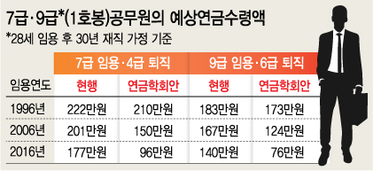2일 머니투데이가 공무원연금 전문가들에게 의뢰해 개혁안에 따라 신규 임용 공무원이 30년 재직후 수령할 연금액을 추산한 결과, 2016년 임용되는 9급 공무원의 월수령액은 76만원으로 나타났다. 7급 공무원의 수령액도 96만원으로 100만원 미만이었다.