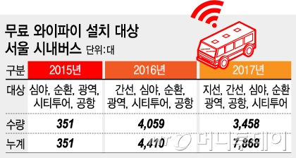 무료 와이파이 적용 버스는 올해 심야·순환·광역·시티투어·공항버스이고, 내년엔 간선버스(지역 간 장거리 운행버스)도 추가된다. 2017년에는 지선버스(간선버스와 지하철 연계 운행버스)까지 추가해 모든 버스에 설치될 전망이다.