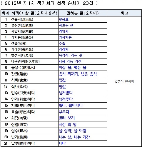 서울시는 올해 광복 70주년을 맞아 공공언어 및 일상어 속에 남아 있는 일본식 한자어나 일본어 투 표현 등 일제 잔재 용어들을 심의해 이중 23개 순화어를 선정했다고 10일 밝혔다.