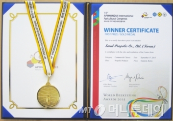 한국원자력연구원 연구소기업인 서울프로폴리스㈜(대표 이승완)는 최근 대전에서 열린 '2015 대전세계양봉대회'에서 WBA(양봉산물 어워드) 아피몬디아 콘테스트 프로폴리스 부문 '그랑프리 금상'을 수상했다고 26일 밝혔다.