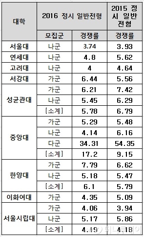 다른 상위권 대학 역시 경쟁률이 하락했다. 성균관대는 가군 6.21대1(전년도 7.42대1), 나군 5.45대1(전년도 6.29대1)의 경쟁률을 보여 가·나군 모두 전년도에 비해 떨어졌다. 이화여대 역시 가군 수능전형에서 4.15대1(전년도 5.09대1)로 내림세를 보였다.