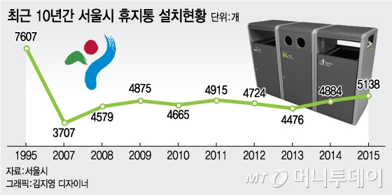 서울시에 따르면 길거리 쓰레기통은 1995년 총 7607개에서 2007년 3707개까지 절반 이상 줄었다. 1995년에 쓰레기종량제가 첫 실시되면서 환경미화원이 대폭 줄고, 자치구 재정마저 악화된 데 따른 것이다. 환경미화원 수는 1995년 8683명에서 지난해 2465명까지 줄었다.