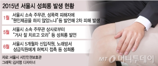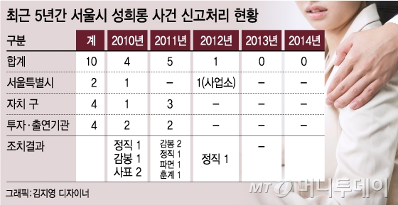 20일 서울시에 따르면 2010년부터 2014년까지 5년간 시가 처리한 성희롱 사건은 10건에 불과했다. 특히 서울시 본청의 경우 사업소를 제외하면 5년간 단 1건 밖에 발생하지 않았다. 25개 자치구와 투자·출연기관을 전부 합친 공무원수가 1만여명이 넘지만 성희롱 사건은 매년 평균 2건에 머물렀다.