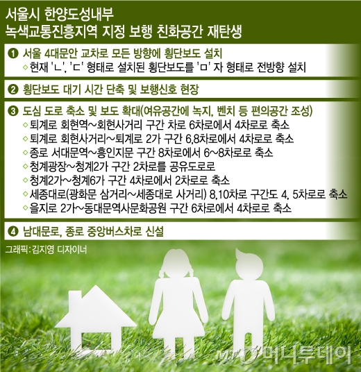서울시가 교차로의 모든 방향에 횡단보도를 설치키로 하는 등 4대문안(한양도성) 서울 도심의 교통 체계를 보행자 중심으로 획기적으로 개편한다. 퇴계로, 청계천로, 세종대로, 을지로 등의 차도를 줄여 보도와 녹색공간을 확대키로 했다. 횡단보도 대기시간도 단축하고, 보행신호도 연장한다.