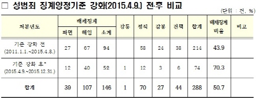 실제로 기준 강화 전(2011년 1월 1일부터 2015년 4월 8일) 배제징계 비율은 43.9%였지만, 기준 강화 후(2015년 4월 9일~2015년 12월 31일) 배제징계 비율은 70.3%에 달했다.