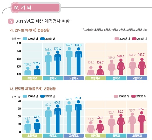 여학생의 경우 2015년 초등학생(6학년) 평균 신장이 152.9cm를 기록했는데 이는 2005년(151.3cm)보다 1cm 이상 커진 것이다. 여학생의 성장이 빠르게 진행되는 중학교(3학년)의 경우 10년 전 159.2cm에서 2015년 160.4cm로 커졌다. 고등학생(3학년) 역시 2005년도 161.2cm에서 2015년 161.7cm로 성장했다.
