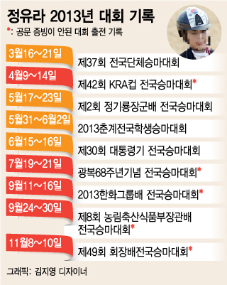 하지만 실제 정씨의 대회출전·수상 실적 중에는 청담고에 공문으로 제출되지 않은 기록도 많았다. 정씨가 2학년이던 2013년 서울승마협회와 대한승마협회 등이 체육특기생의 시간할애를 요청하며 청담고에 보낸 공문은 총 10건이다. 2013년 중 마지막으로 공문이 등록된 시기는 10월10일. 하지만 정씨는 그해 11월8~10일에 열린 제49회 회장배전국승마대회에 출전해 마장마술 A클래스, S-1클래스에서 각각 1위를 차지했다.