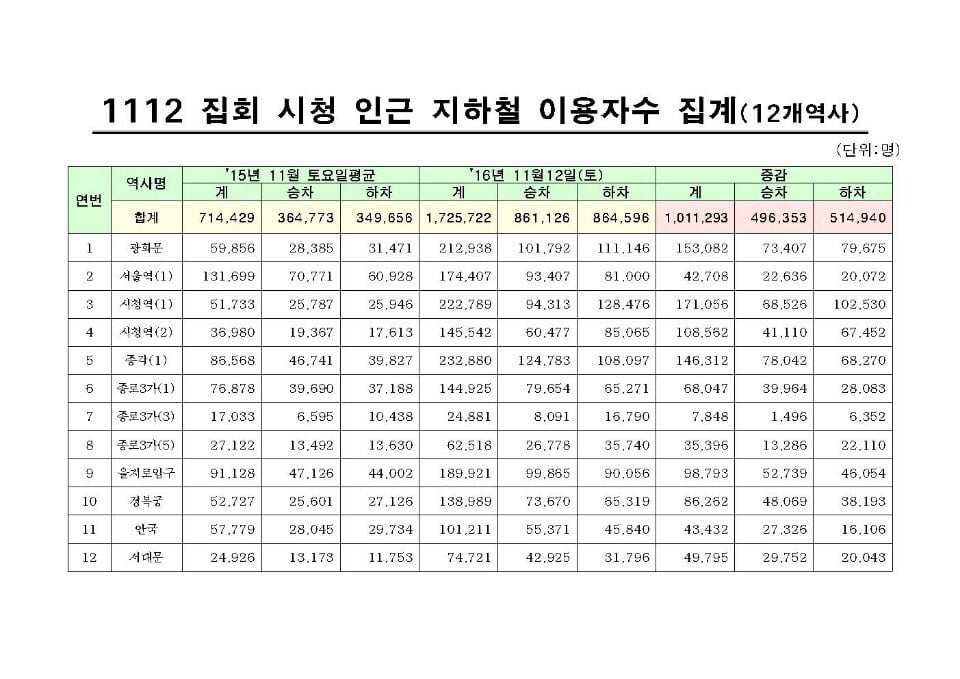하차 역사에서 재승차해 중복 집계되는 경우를 고려하더라도 이날 집회 장소 인근 역사 이용객 수가 작년 대비 50만 명 이상 증가한 것으로 파악된다.