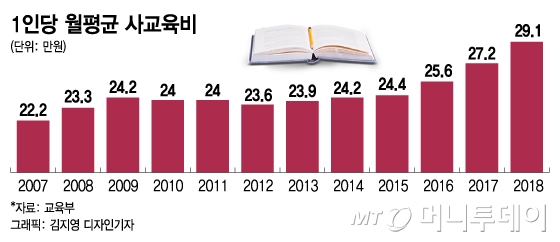 교육부에 따르면 지난해 사교육비 총액은 19조5000억원으로 2011년(20조1000억원) 이후 최고치를 기록했다. 교과와 예체능 사교육비도 각각 전년대비 5.0%와 3.1% 증가했다. 학생 1인당 월평균 사교육비도 29만1000원으로 역대 최고치를 갈아치웠다. 사교육 참여율도 72.8%로 2010년(73.6%) 이후 8년만에 가장 높았다.