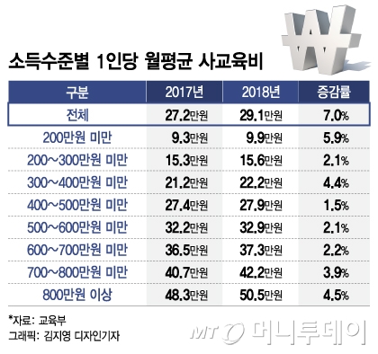 ◇사교육 모든 지표 '악화'…저소득층마저 사교육 참여↑= 교육부에 따르면 지난해 학생 1인당 월평균 사교육비는 29만1000원으로 조사됐다. 지난 2007년 조사가 시작된 이후 역대 최고치다. 특히 2016년부터 증가세가 시작돼 3년째 1만원 넘게 늘고 있다. 사교육비총액도 19조5000억원으로 2011년(20조1000억원) 이후 가장 많았다. 학생 수가 573만명에서 558만명으로 2.5% 줄었는데도 사교육비 규모가 훨씬 커졌다.