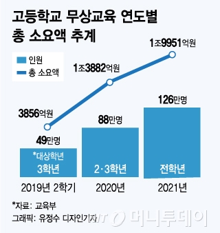 입학금과 수업료, 학교운영비, 교과서대금을 무상으로 지원하는 고교 무상교육에 따른 소요예산은 매년 약 2조원이다. 단계적 도입 첫해인 올해 2학기 고3(49만명)에 대한 소요재원은 3856억원이다. 고2~3(88만명)까지 확대되는 내년에는 1조3882억원이 필요하고, 고교 무상교육이 완성되는 2021년에는 전학년(126만명)에 1조9951억원이 투입돼야 한다.