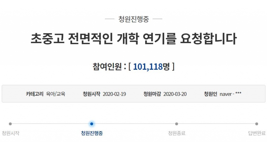 코로나19(신종코로나바이러스) 확산 우려로 전국 초·중·고등학교의 개학을 전면 연기해달라는 국민청원이 동의 10만명을 넘겼다.